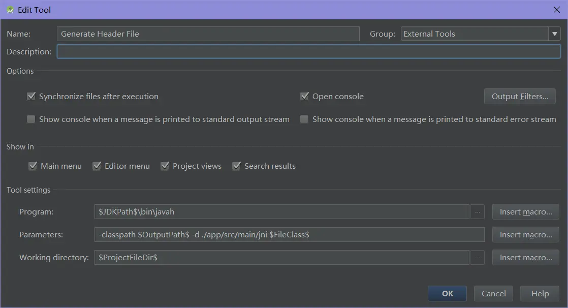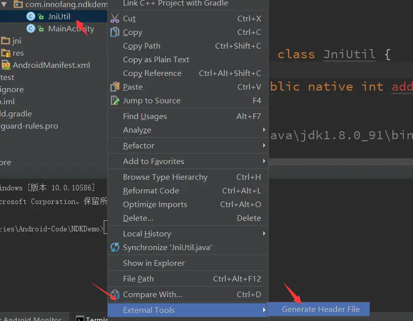 在这里可以利用一个小技巧,就是利用 Android Studio 的 External Tools 工具 ,一件生成头文件