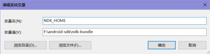 新建系统变量,将变量名( NDK_HOME )和变量值 (自己NDK文件路径)如下输入