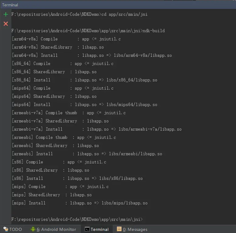 cd app/src/main/jni # 将位置切换到 jni目录下ndk-build