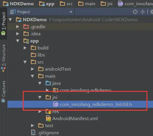 切换到 Project 视图,就可以看到在 main 包下多了一个 jni 的文件,里面就是刚刚生成的头文件