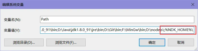 然后添加到 path 中 %NDK_HOME%\ ,如果是添加在最后要记得在前面加个分号