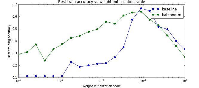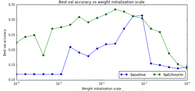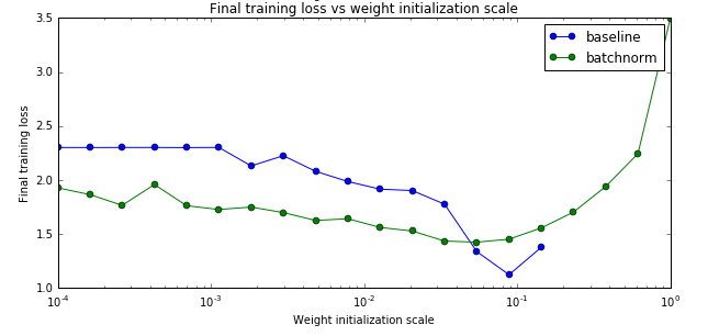 从上面的图可以看出,确实使用了bn后参赛初始化的问题变得好一些了【当然不会完全解决】。另外最后一个图不使用batch norm的baseline对于初始化过大的参数会出现不能训练的情况,因此图中有部分不能绘制。
