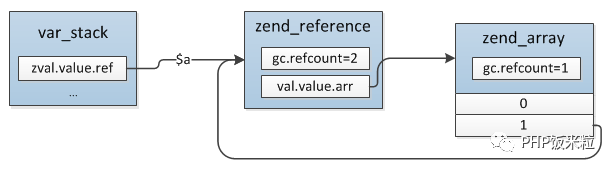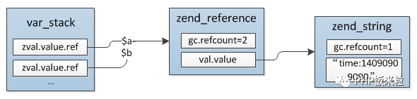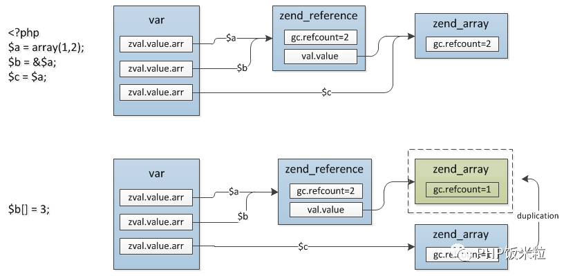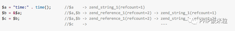 $b = &$a这时候$a、$b的类型是引用,但是$c = $b并不会直接将$b赋值给$c,而是把$b实际指向的zval赋值给$c,如果想要$c也是一个引用则需要这么操作: