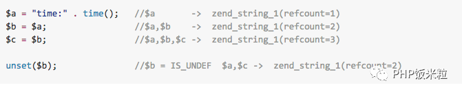 这个不跟上面的例子一样吗?字符串"hi~"有$a/$b两个引用,所以zend_string1(refcount=2)。但是这是错的,gdb调试发现上面例子zend_string的引用计数为0。这是为什么呢?