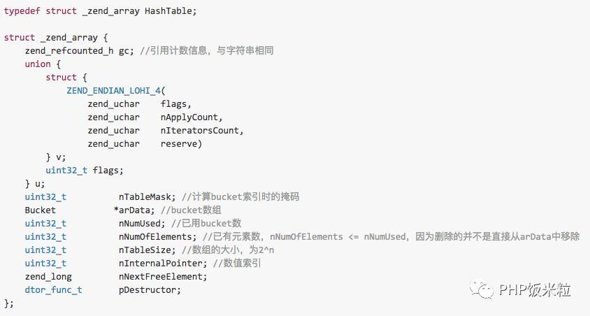 array是PHP中非常强大的一个数据结构,它的底层实现就是普通的有序HashTable,这里简单看下它的结构,下一节会单独分析数组的实现。