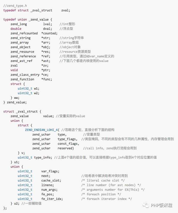 zval结构比较简单,内嵌一个union类型的zend_value保存具体变量类型的值或指针,zval中还有两个union:u1、u2: