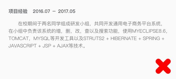 但这里有一个问题,通常你的简历最先看到的是hr,通过hr删选一遍之后在发给你投递职位的部门领导,也有很多公司是简历同时发送到hr和部门领导,但即便是在这种情况下你的简历可能还是hr先看到,所以这个时候你的工作经验就不能这样写: