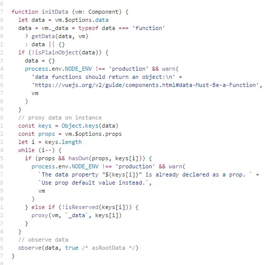 在这个方法里,会对props, data, computed 等属性利用 Object.defineProperty 将这些属性全部转化为 getter/setter。