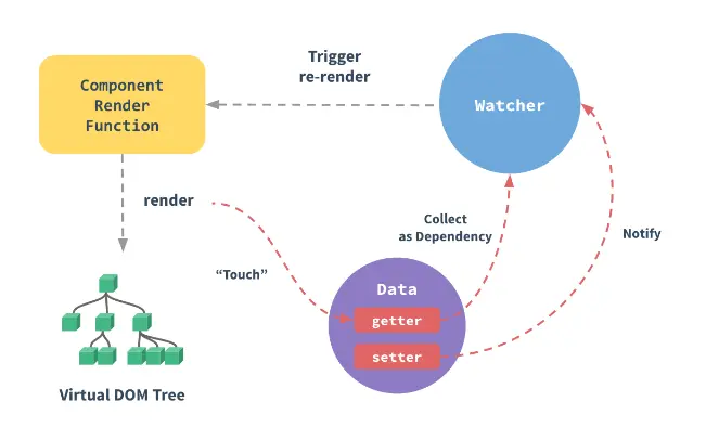 watcher: Compiler 的解析结果与 Observer 结合起来,在 Observer 监听到数据发生改变时,接受通知,进而触发 re-render, 重新渲染DOM。