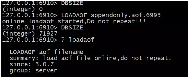 { "LOADAOF", "aof filename", "load aof file online", 9, "3.0.7"}, { "LOADRDB", "rdb filename", "load rdb file online,which can not repeat !!!", 9, "3.0.7"}