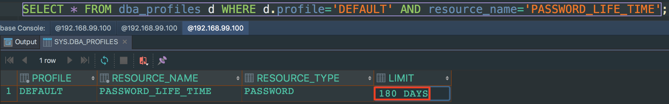Oracle11g在default profile中设定了180 days。PS:有人肯定会问这不是180天吗跟7天有什么关系,在这里不作详细解释。 - 具体解决方案等会使用Intellij IDEA 连接后解决。PS:主要是好操作。