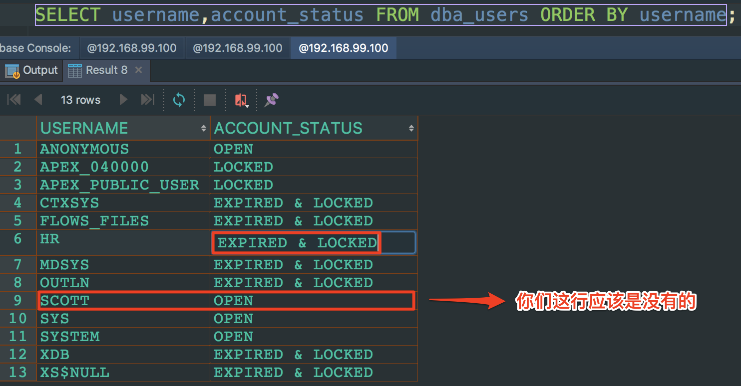 SQL SELECT username,account_status FROM dba_users ORDER BY username;