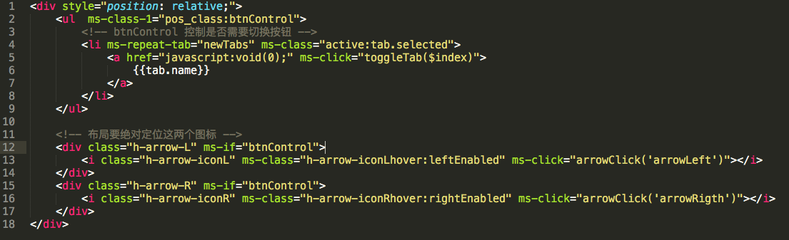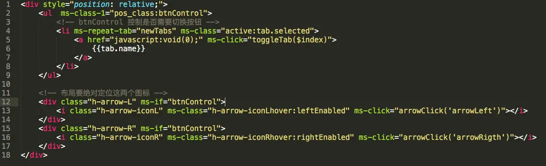 上面的DOM结构由此组件的5个属性来决定它的展示,首先看到第一个属性那就是,btnControl属性,这个属性的值决定是否要显示左右切换的按钮,可以看到下面那两个按钮的DOM渲染也是使用这个属性控制,第二个属性newTabs,这是一个tab项的数组,它会随着点击切换tab而及时变更,所以显示的tab项会及时变更,第三四个属性分别是leftEnabled,rightEnabled,这两个属性控制按钮是否可点击,第五个属性是一个方法,arrowClick用来点击切换