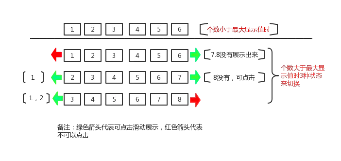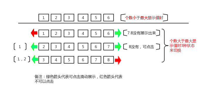 (2) 当返回的数据过多,需要展示的状态有如下三种(假设页面最多可以显示6个,数据有8个)