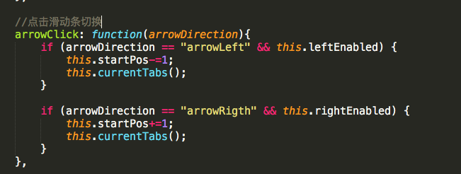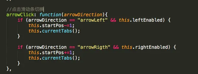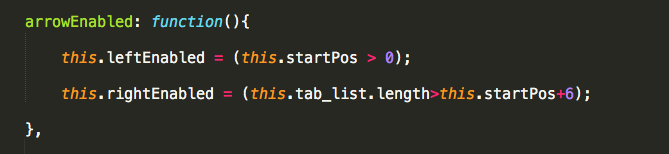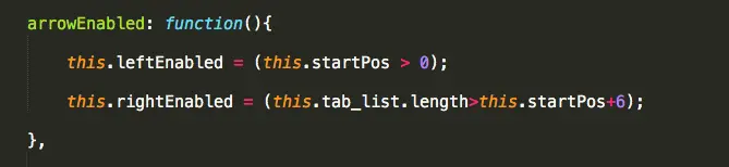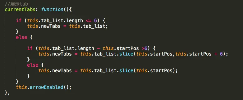 此处的逻辑单独写在一个方法中,因为当调用切换方法时,还需要此段逻辑的处理,通过一个变量startPos的值来截取需要展示的tab项,startPos值代表了显示在页面上的第一项在数组中的索引,因为显示在页面上的第一项会随着点击的左右切换而变化,其实第一项显示的内容就是数组在截取时的开始位置,此处需要思考清楚