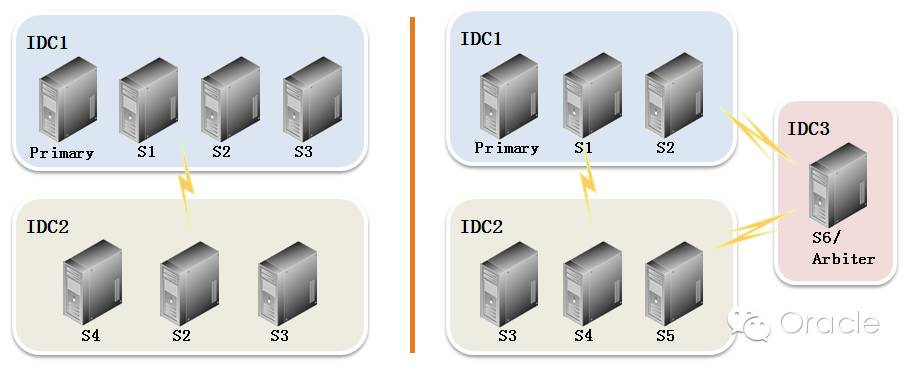 右图为两个数据中心成员数量相同,第三个地方放一个用于决定胜负的副本节点(可是仲裁节点)