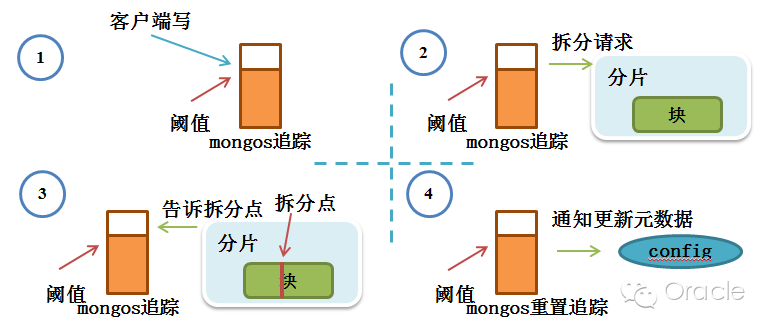 拆分完毕,mongos 重置原始块的追踪以及新建新块追踪;