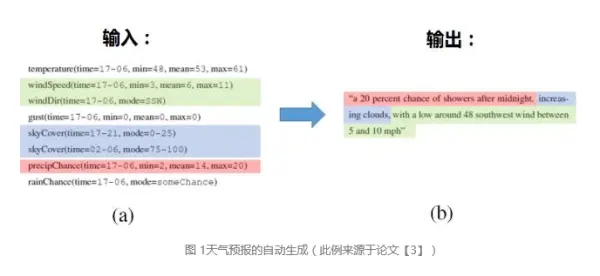 不同于这些任务,本文主要与大家分享的是基于结构化数据的文本生成,即用户输入结构化的数据,机器输出描述和解释结构化数据的文本。(注:为了简便,下文中的文本生成均指基于结构化数据的文本生成。)该任务的特点是基于数据和事实说话。文本生成的典型商业应用包括财经和体育类新闻报道的生成、产品描述的生成、商业数据的分析和解释、物联网(Internet of Things)数据的分析和解释。图1给出了天气预报自动生成的例子。其中,图1a是各种感知器采集到的结构化的天气数据,机器将图1a中的数据作为输入,输出图1b中的天气预报。