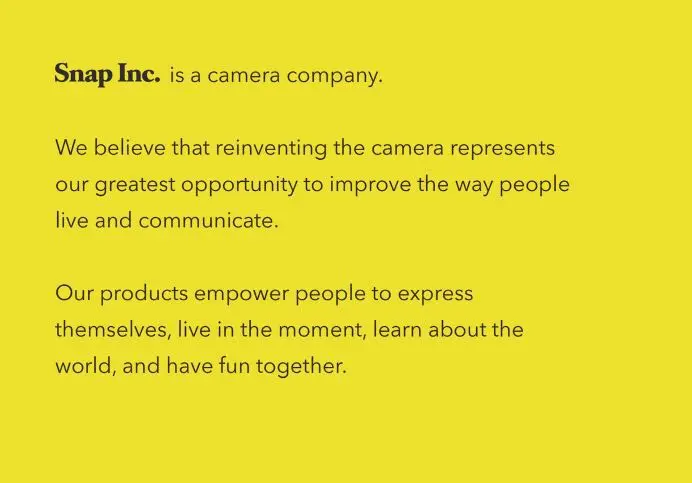 We believe that reinventing the camera represents our greatest opportunity to improve the way that people live and communicate. Our products empower people to express themselves, live in the moment, learn about the world, and have fun together.