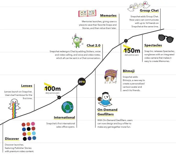 - 2016年推出On-Demand Geofilters、Chat 2.0、memories、Bitmoji