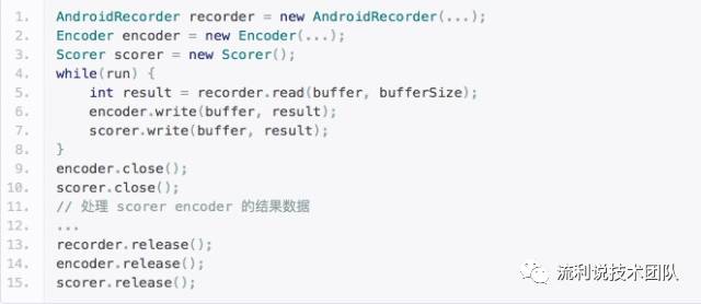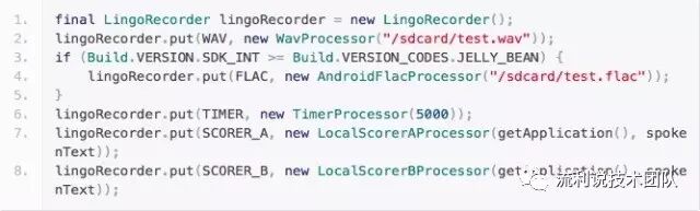 如上代码,LingoRecorder 在录音的时候,挂载了多个 AudioProcessor,能够同时生成多种音频目标文件,方便选取更加适合的文件格式,并且还可以根据不同 api 选取更加合适的 Encoder,做兼容处理也更加简单。还可以同时挂载 A/B 两个版本的打分器,更加直观比较两种实现的不同。