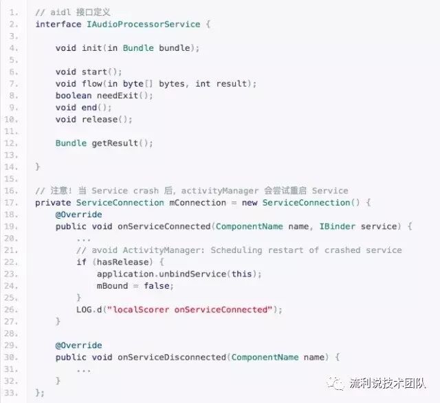 Recorder 调用到的 Encoder 与 Scorer 属于 ndk 层。所以如果录音出错了,在某些情况可能会出现 native crash 的情况,而对于用户来说,这样体验是非常糟糕的。但是在这种稳定性的问题无法避免的情况下,如果出现 native crash,让用户感知到录音出错,提示其重试录音会是一个相对较好的体验。因此我们可以引入 IAudioProcessorService 将 AudioProcessor 放在 Service 中执行,并且该 Service 处于另外一个进程。就此倘若出现 native crash,只有相关 AudioProcessor 进程会因为异常而被杀掉,主进程并不会受到影响,只需处理相关异常,提示用户重试即可。