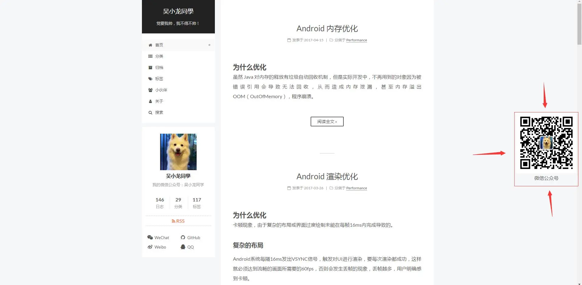 其实我最初的想法把二维码固定在一个位置,前端不怎么会,一直没去弄,最终我还是花点时间去看了。_layout.swig是页面模板文件,固定二维码应该写在这个文件,于是我网上找了如何写固定内容,找到一个放在右下角代码,但与置顶按钮冲突,又想放到左下角,改改代码,看了效果,似乎不太搭,又改到右上角,页面两边平衡了,还是感觉那里不对劲,想了想,干脆放右边且垂直居中,改改代码,搞定,_layout.swig代码: