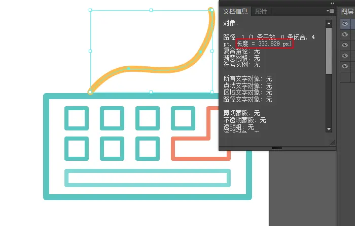 这两段代码类名那里不用解释了,.border和.keyboard都是刚才对应的svg代码中<g class="">的类名,换句话说,就是我们AI对应的图层的命名,所以这里就很好理解了,每段CSS代码都对应控制自己的图形元素,再继续看stroke-dasharray(虚线间隔)和 stroke-dashoffset(虚线偏移值),border(即键盘外轮廓)和keyboard(键盘按键)定义了不同的值,那这个值从何而来,很简单,它们对应的都是图形路径的长度,这时,祭出我们的AI神器。