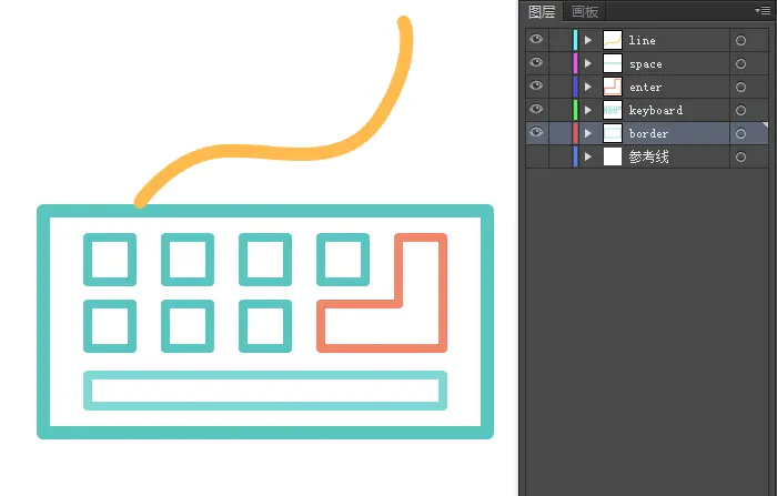 这里把回车键单独拿出来,并不是因为颜色的问题,而是回车键的路径长度要比小的按键要长很多,我要赋给它更长的动画时间,前面轮廓和按钮的绘制我是逆时针方向,回车键绘制时我采用了顺时针方向,给动画一点小小不同的变化,这个图层我命名enter。