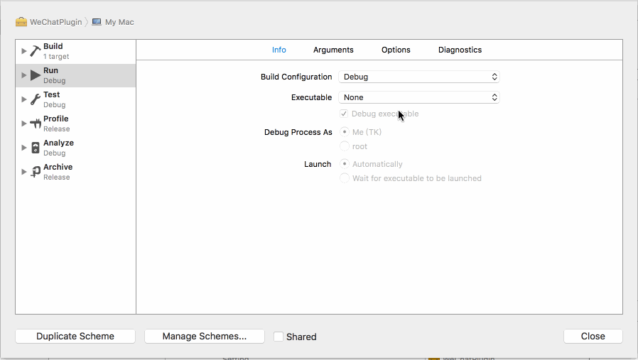 编辑 Scheme,在 Debug 模式下启动 WeChat。