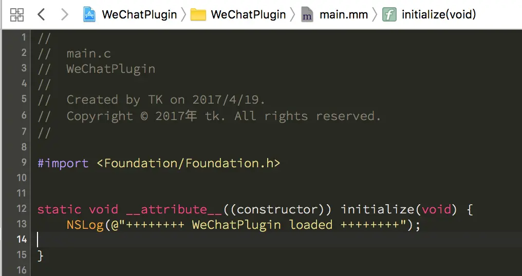 NSLog(@"++++++++ WeChatPlugin loaded ++++++++");