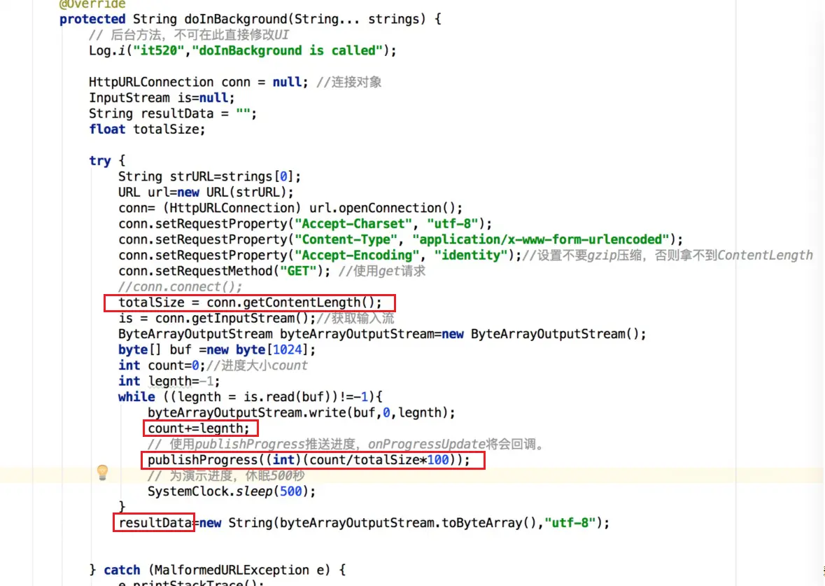 2.计算出进度后,调用publishProgress去推送进度,调用此函数后,onProgressUpdate才会回调,并且我们将会在onProressUpdate中设置进度控件的值。