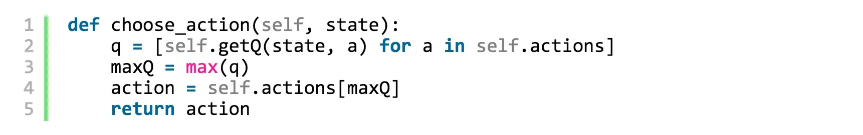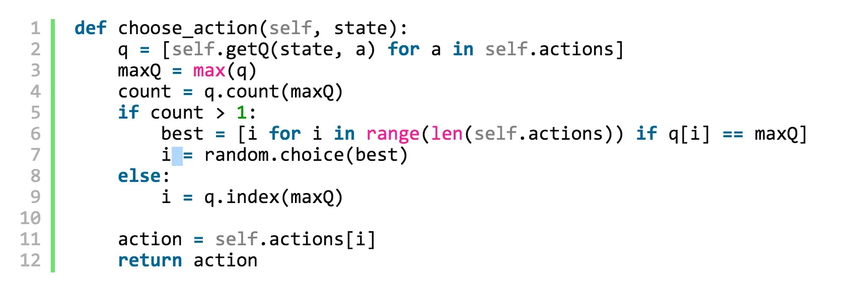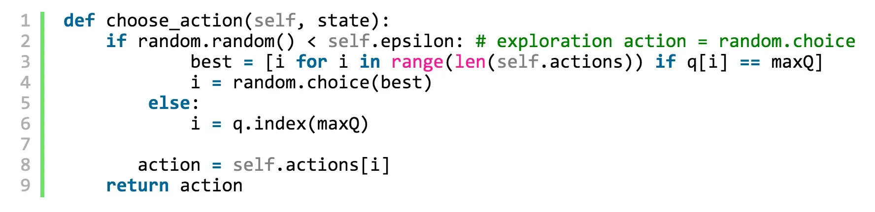 是不是这样就可以了呢?大家想一下,万一在当前动作收益很小,小收益到达的状态的后续action可能会更大,所以,我们不能直接选取最大的收益,而是需要使用一个新的技术来探索,在这里,我们使用了epsilon,首先我们用产生一个随机值,如果这个随机值小于epsilon,那么下一个action会是随机动作,否则采用组大值,代码如下
