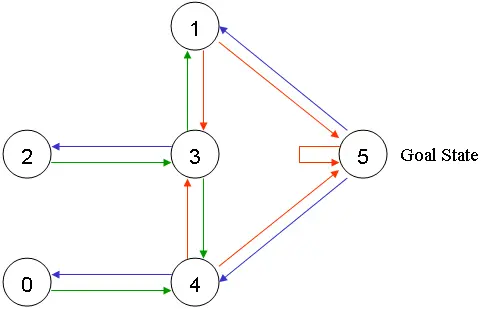 现在假设我们在状态2,从状态2可以到状态3,而无法到状态0、1、4,因为2没法直接到0、1、4;从状态3,可以到1、4或者2;而4可以到0、3、5;其它依次类推。