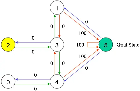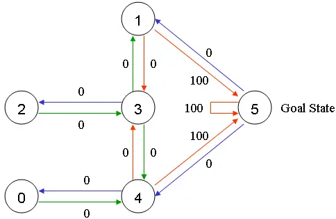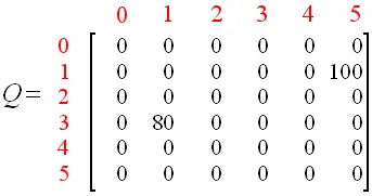 Q(1, 5) = R(1, 5) + 0.8 * Max[Q(5, 1), Q(5, 4), Q(5, 5)]= 100 + 0.8 * 0 = 100