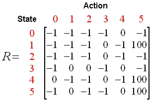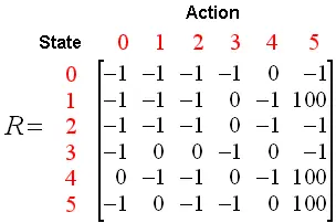 这个矩阵就是传说中的Q矩阵了,这个矩阵的列表表示的是当前状态,而行标表示的则是下一个状态,比如第三行的行标是2,如果取第四列,比如说2,4就表示了从2->4的收益是0,而-1就表示了没法从一个状态到另外一个状态。