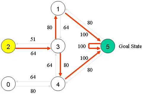Q(3, 1) = R(3, 1) + 0.8 * Max[Q(1, 2), Q(1, 5)]= 0 + 0.8 * Max(0, 100) = 80