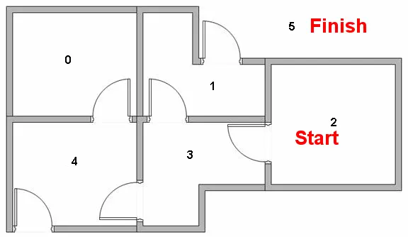 假设我们有5间房,如下图所示,这5间房有些房间是想通的,我们分别用0-4进行了标注,其中5代表了是是出口。