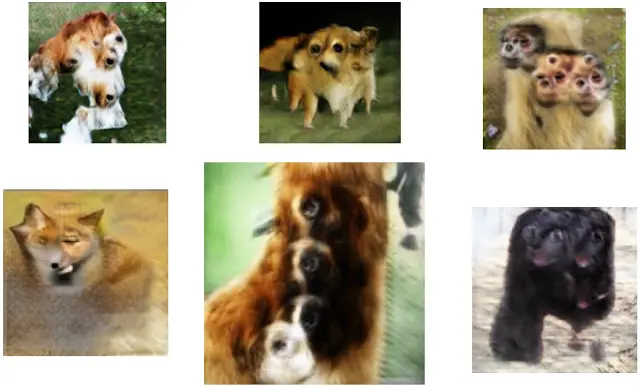 上图展示了生成的身体部位数量错误的动物,这些是使用 128x128 ImageNet 数据集训练的先前 GAN 模型生成的。上图是 Ian Goodfellow 的 NIPS 2016 教程《生成对抗网络》(Generative Adversarial Networks) 中的第 29 图。 |