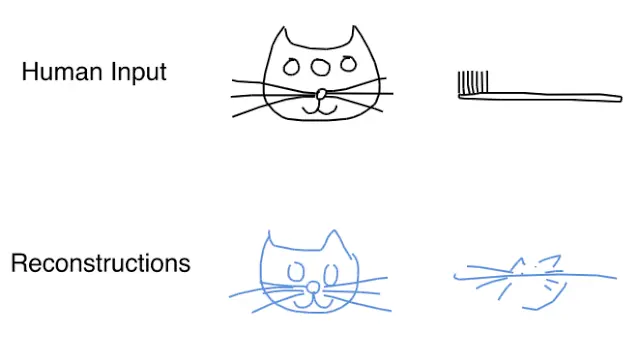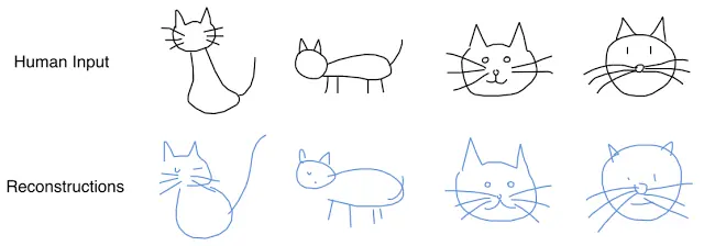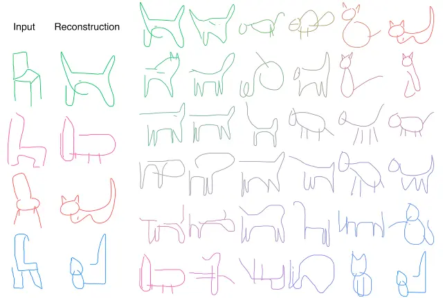 在我们的模型中,我们刻意向隐向量添加噪音。在我们的论文中,我们展示了通过将噪声引入编码器和解码器之间的通信通道中,让模型无法再准确地再现草图,而是必须学会以噪音隐向量的形式捕捉草图的本质。我们的解码器将使用这个隐向量生成用于构建新简笔画的一系列动作。在下图中,我们将几个表现真实的猫的样子的简笔画输入编码器中,以使用解码器生成重建的简笔画。