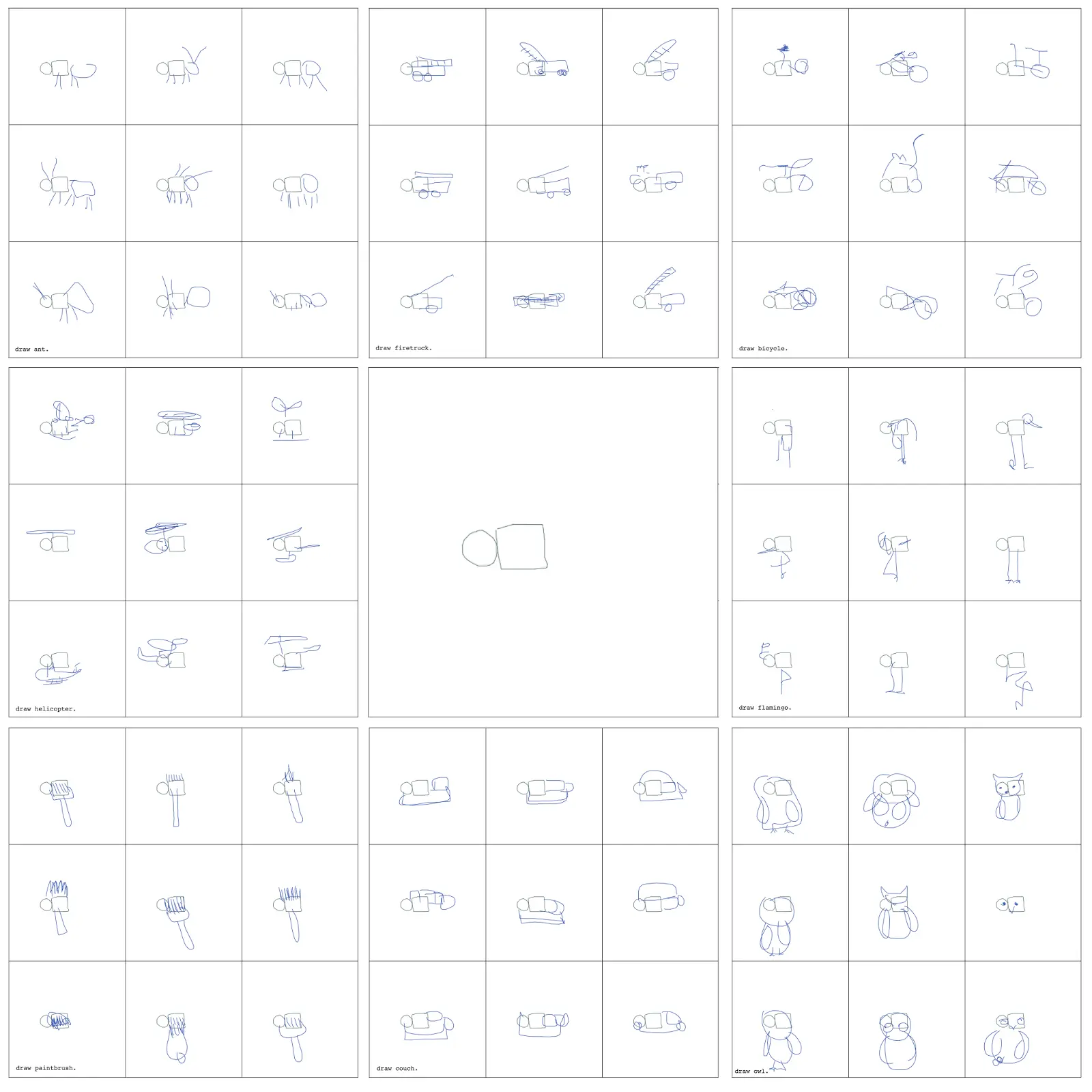 我们可以进一步展开该概念,用不同的模型完成同样的不完整简笔画。在下图中,我们看到如何使同样的圆形和方形成为蚂蚁、火烈鸟、直升机、猫头鹰、沙发甚至画笔等物体的一部分。通过使用训练绘制不同物体的一组多样的模型,设计人员可以探索向受众传达有意义的视觉信息的创新方式。