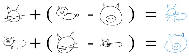 确实,我们发现受过猫和猪绘制训练的模型可以进行简笔画绘制类比。例如,我们可以从整头猪的隐向量减去已编码的猪头的隐向量,从而得到一个表现身体概念的向量。将这一区别添加到猫头的隐向量中,从而得到一只完整的猫(即,猫头+身体=整只猫)。这些绘图类比让我们可以探索模型是如何组织其隐空间以在生成的众多简笔画中体现不同概念。