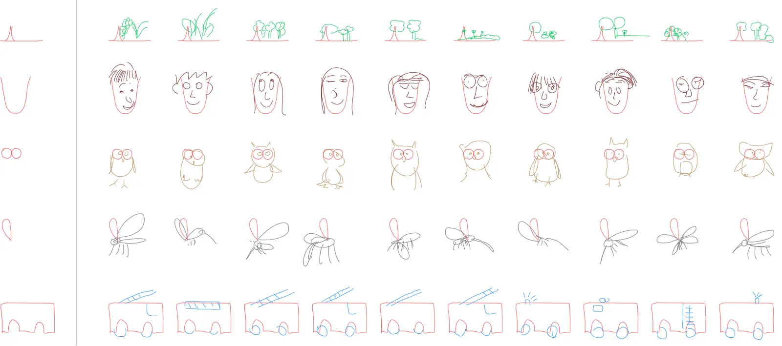 我们还可以使用 sketch-rnn 的解码器模块作为独立模型,并训练它预测不完整简笔画的各种可能的结尾。通过建议完成不完整作品的备用方法,可将这一技术应用于通过模型协助艺术家进行创作。下图中,我们绘制了不同的不完整简笔画(红色的),并且让模型以不同的可能方式完善这些绘图。