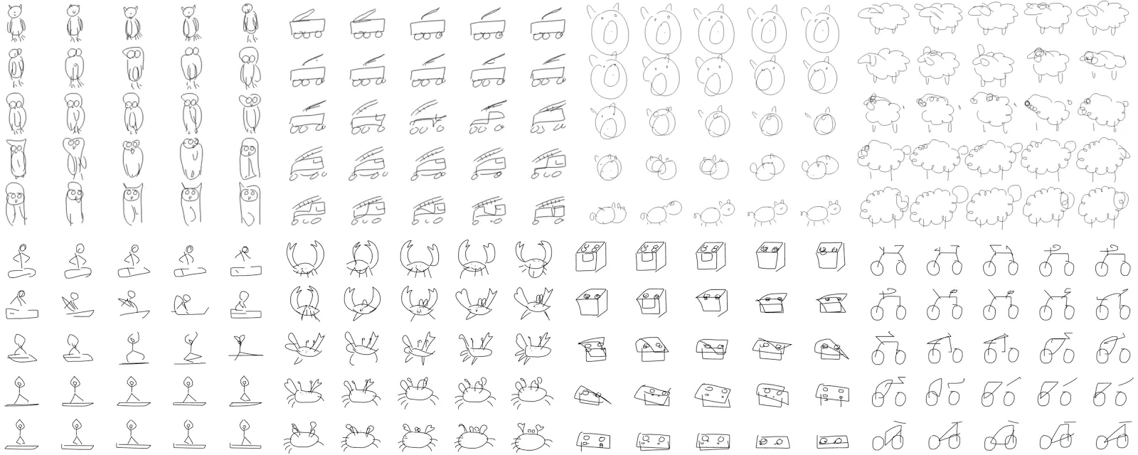 简笔画绘图的神经表征》(A Neural Representation of Sketch Drawings) 中,我们提出了一个能够生成常见物体简笔画的生成式