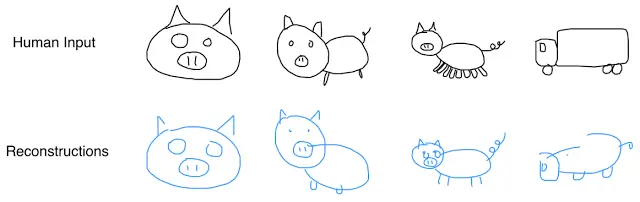 还是不太相信?我们再用一个受过小猪简笔画训练的模型来重复此实验,看看能不能得出相似结论。如果输入一只有八条腿的猪,该模型生成的形状将与猪相似,并且只有四条腿。如果向画猪的模型输入一辆卡车的简笔画,那么它就会画出一头长得像卡车的猪。