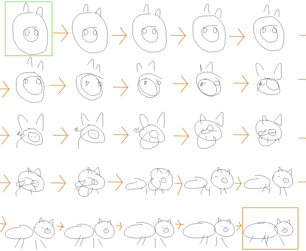 | 受过猫和猪简笔画绘制训练的模型的隐空间插值。 |