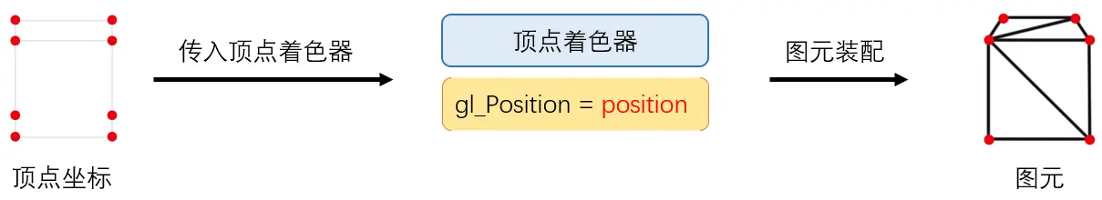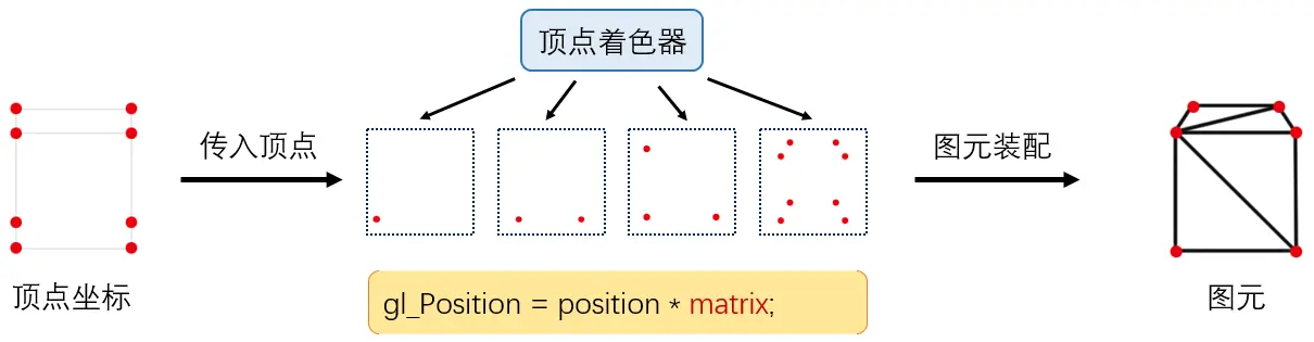 如上图,顶点着色器会先将坐标转换完毕,然后由GPU进行图元装配,有多少顶点,这段顶点着色器程序就运行了多少次。