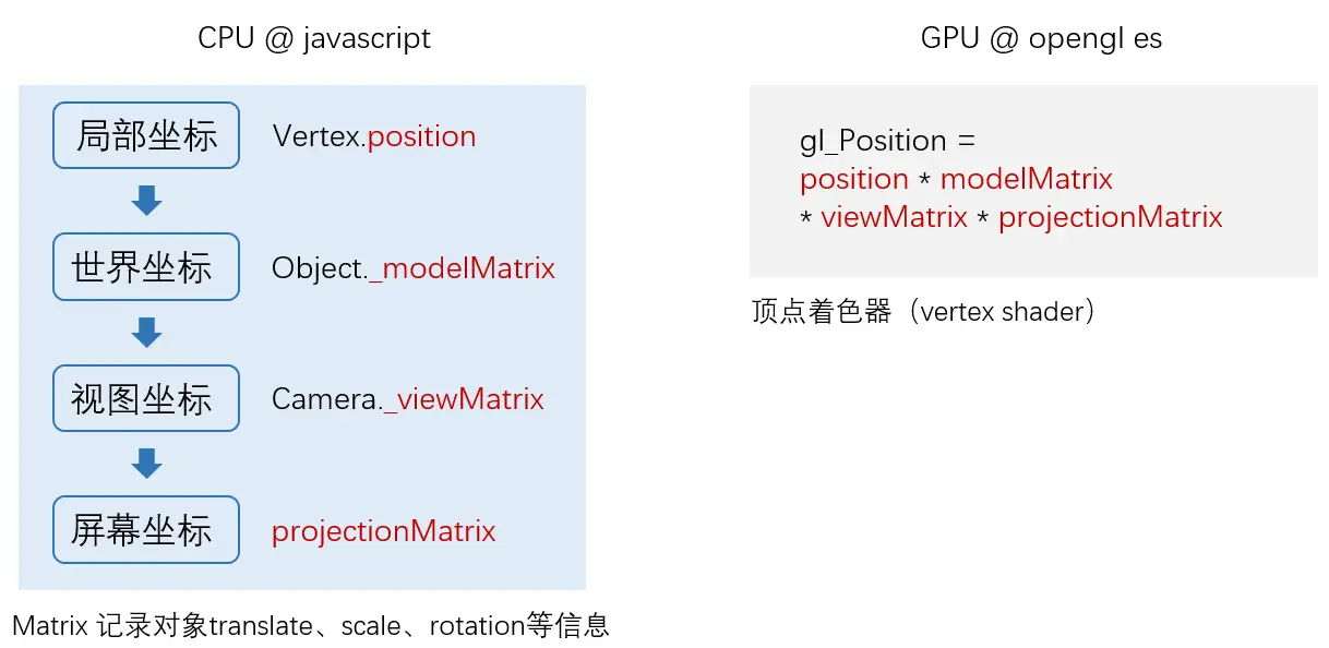 我们引入了一个新的名词,叫“顶点着色器”,它由opengl es编写,由javascript以字符串的形式定义并传递给GPU生成。