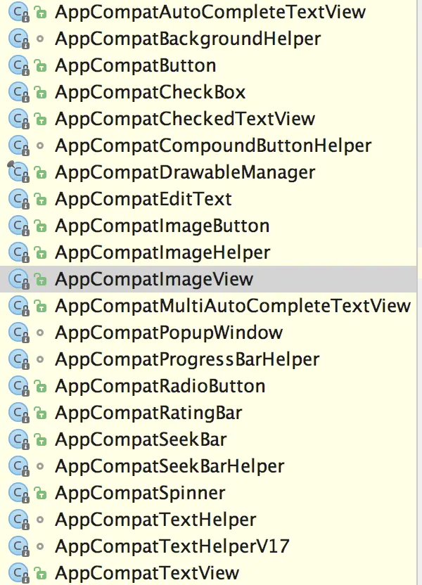 可以看到这些被重写的 UI 控件都是 AppCompat 开头的,但是如果重写了这么多控件,现有项目直接硬替换起来,工作量就会非常大,所以 AppCompatDelegate 这种以代理的方式自动为我们替换所使用的 UI 控件的功能就非常的有必要了。