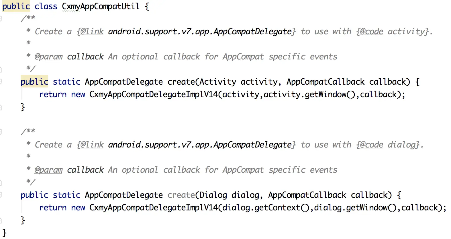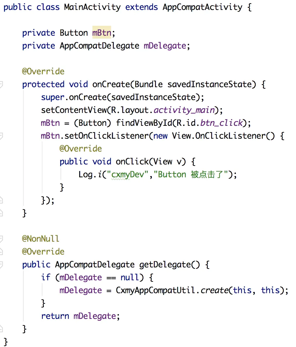 然后自己定一个 AppCompatDelegate 根据类,用于返回 AppCompatDelegate,这里只是做演示,所以直接返回上面定义的 AppCompatDelegate 类了。